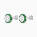 Elegant Platinum (PT950) Round Diamond and Emerald Halo Stud Earrings with Milgrain Detail