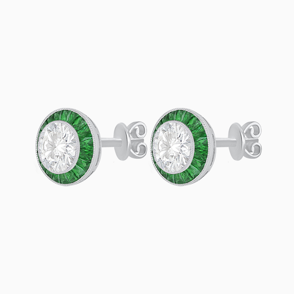 Discover timeless sophistication with these luxurious stud earrings crafted from Platinum 950, weighing 4.13 grams. Featuring two sparkling SI1-I clarity round diamonds totaling 2.35 CT, each gemstone is beautifully framed by vibrant emeralds totaling 1.05 CT. Elegant milgrain detailing enhances their vintage-inspired halo design. Designed for comfort and security, these earrings come fitted with butterfly-back closures, making them the perfect choice for effortless elegance at any occasion.