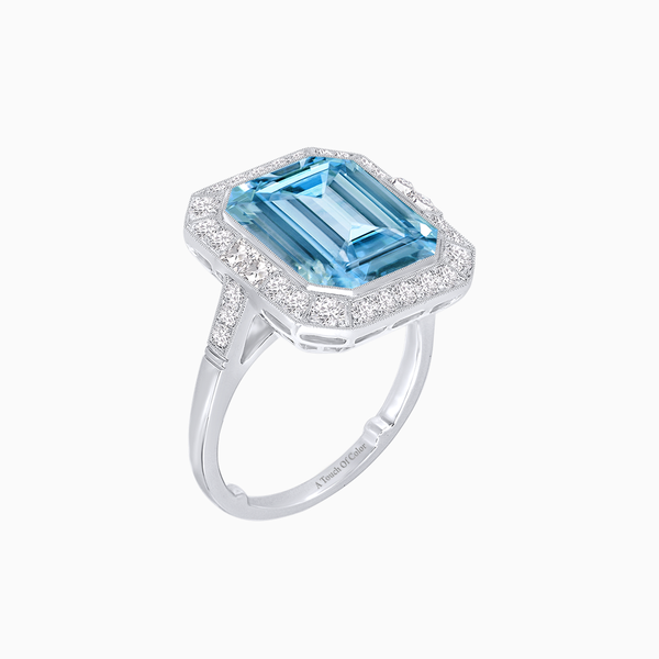 Bathed in the serene glow of the sea, this Art Deco treasure captures the elegance of a bygone era. Crafted in rich PT950 platinum (9.32 grams), the design centers on a luminous 5.71 ct emerald-cut aquamarine — its crystal-clear depths reminiscent of sunlit ocean waters. Surrounding it, a halo of 0.76 ct of round and French cut diamonds sparkles like foam-kissed waves, each gem framed in fine hand-applied milgrain that whispers of old-world artistry. The openwork under-gallery reveals a lace of platinum, ensuring that beauty flows from every angle. A ring not merely worn, but lived with — perfect for the romantic soul who carries the ocean in their heart.
