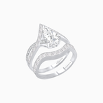 From the side, delicate openwork beneath the center stone allows light to flood through, intensifying its sparkle, while the contoured band ensures both beauty and comfort. The harmonious pairing of both rings creates a fluid V-shaped silhouette, drawing the eye to the luminous pear centerpiece — a symbol of elegance, romance, and timeless style.